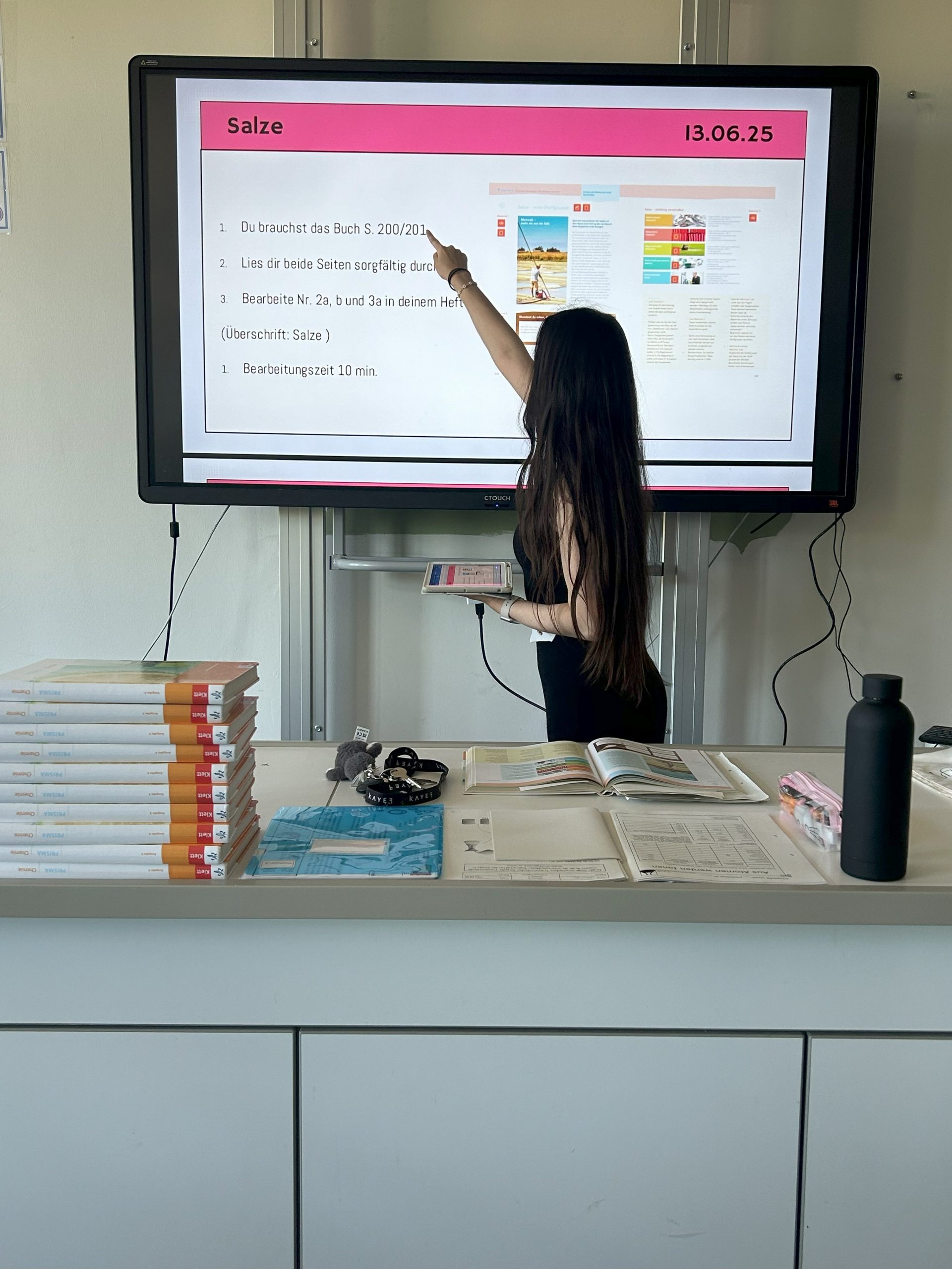 Auf dem Bild ist eine Lehrerin zu sehen, die ihre Präsentation vom iPad mit dem C-Touch spiegelt und mit den Schüler:innen im Lehrbuch arbeiten möchte. Der Bücherstapel liegt auf dem Pult, sowie ein paar Stapel Arbeitsblätter und Schreibmaterial. Dieser Moment soll den Wandel der Schule und den Einsatz digitaler Medien symbolisch darstellen.